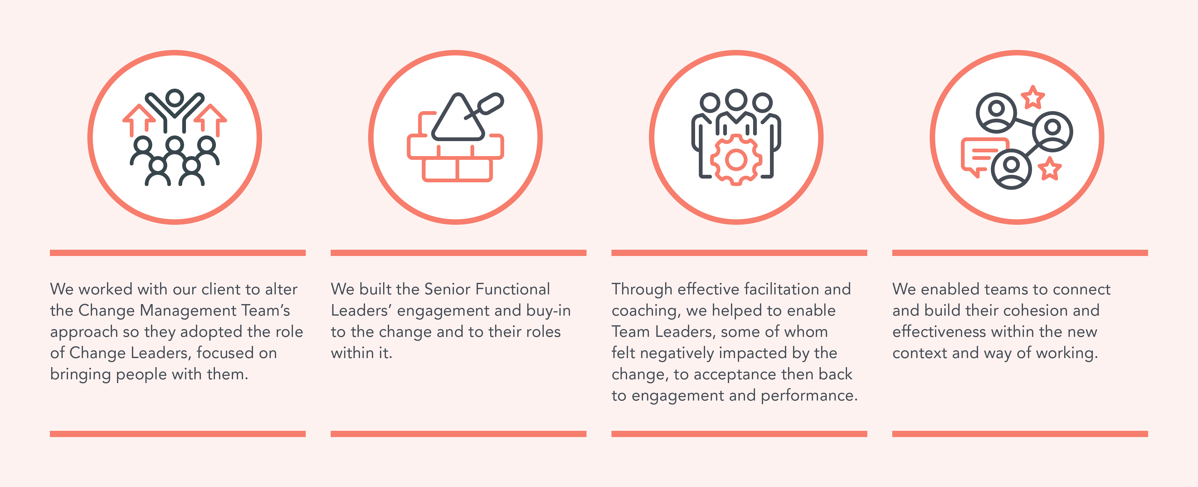 We catalysed change through a deep understanding of the human systems and by addressing the needs of the people, rather than the process, winning hearts and minds to help implement the ambitious organisational transition. Here is what our client said about our approach: